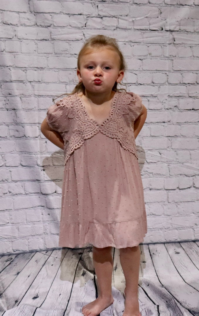 Look stylish and elegant this season with the Girls Laced Mini Dress. Its taupe color and short sleeve design provide a timeless look, while the delicate lace accents refine any wardrobe. Perfect for school, parties, or special occasions.