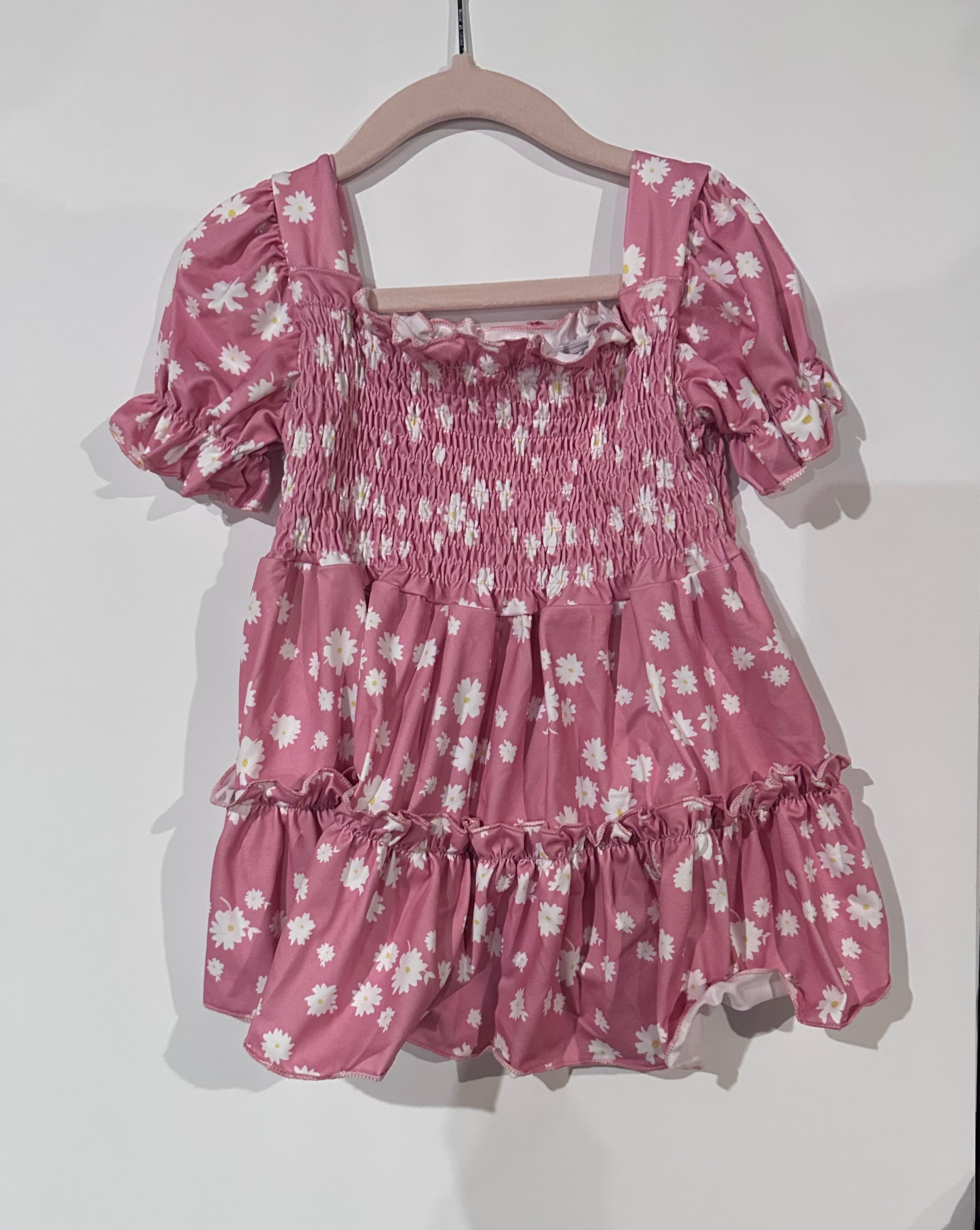 This girl's pink flowered dress features an elastic top with short sleeves and a ruffle hem that can be worn off the shoulders for a unique look. Perfect for special occasions, the lightweight fabric ensures comfort, while the vibrant colors make this dress stand out.