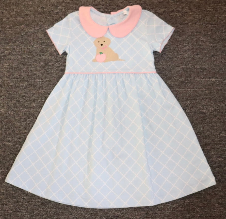 This Girl's Empire Dress features a baby blue and white diamond pattern retriever applique short sleeve and a bright pink collar. This dress is perfect for any occasion, as it is sure to turn heads while still maintaining an elegant and timeless look.